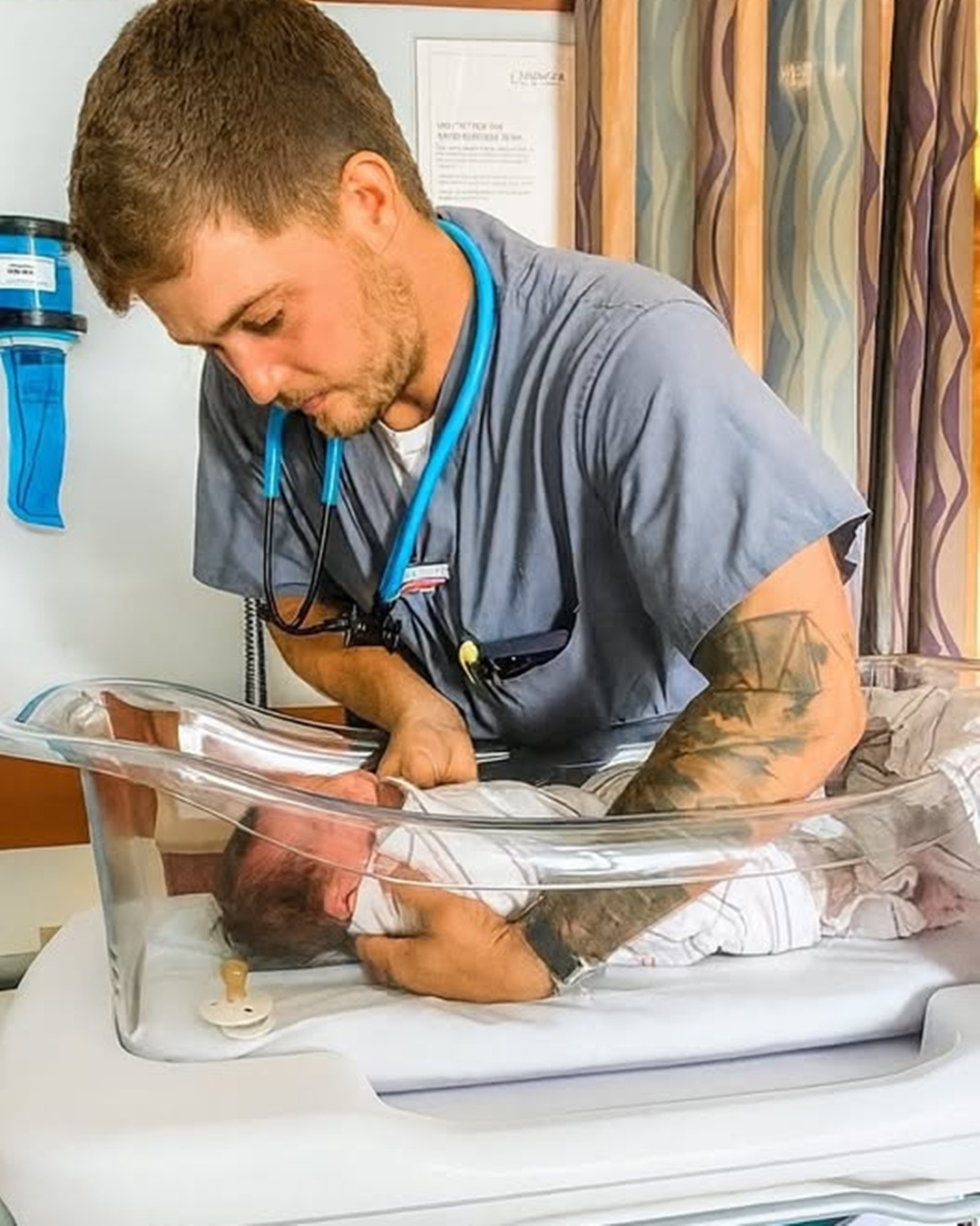 The moment he walked into the labor and delivery room, I froze for just a second.He was young — maybe 28. His arms were covered in tattoos, his build solid and strong, his posture more like a soldier than a…